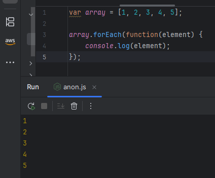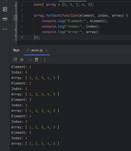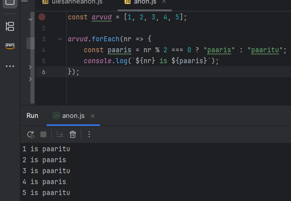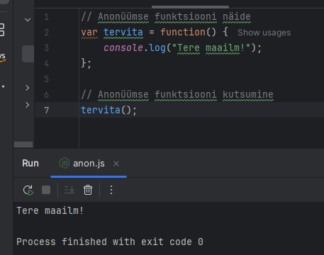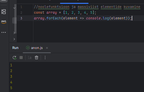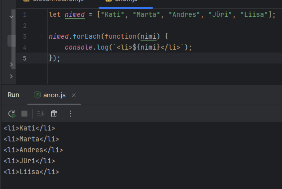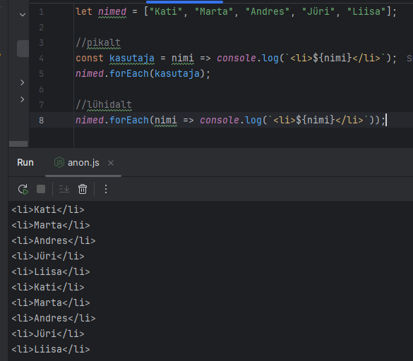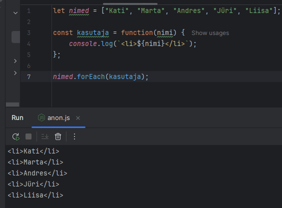 Anonüümseid funktsioone saab kasutada massiivi elementide kuvamiseks mitmel erineval viisil. Näiteks forEach meetodi kasutamine