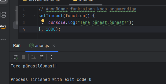 Anonüümseid funktsioone saab kasutada argumentidena teistele funktsioonidele, näiteks sündmuste käitlemiseks või ajaliste viivituste loomiseks.