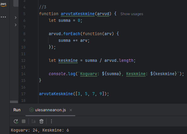 console.log(`Koguarv: ${summa}, Keskmine: ${keskmine}`);
